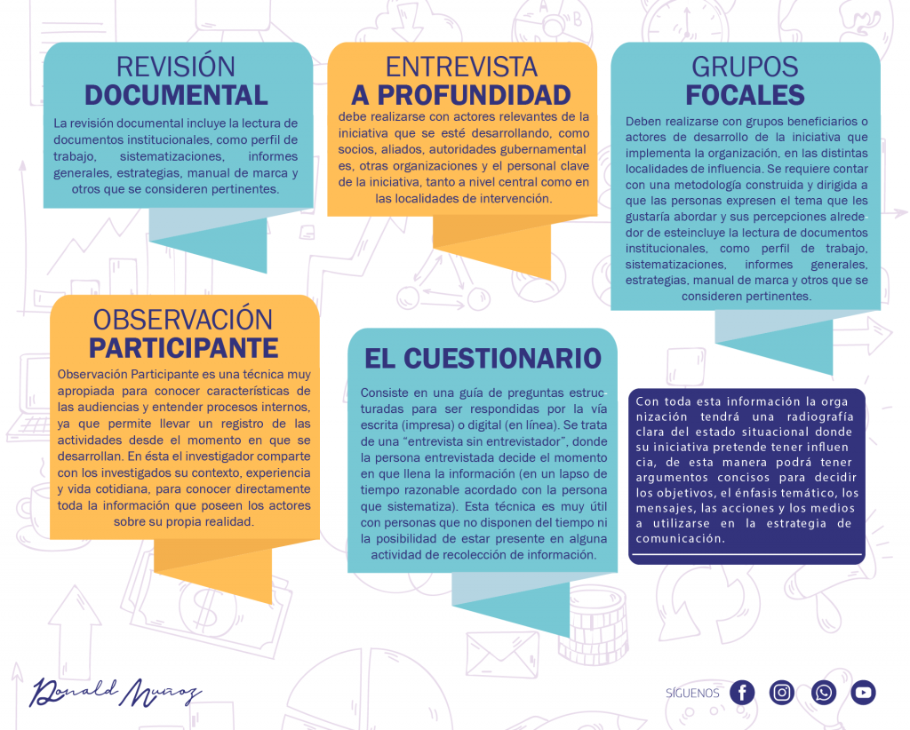 Todo ello a través de técnicas de investigación como la revisión documental, entrevistas, grupos focales, cuestionarios y observación participante, entre otros.