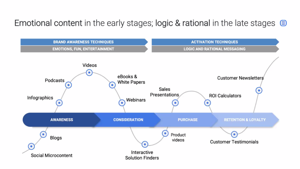 Buenos ejemplos de contenidos para esta fase son: artículos en el blog, infografías, videos en línea, newsletters, contenidos instructivos, podcasts y publicidad emocional.